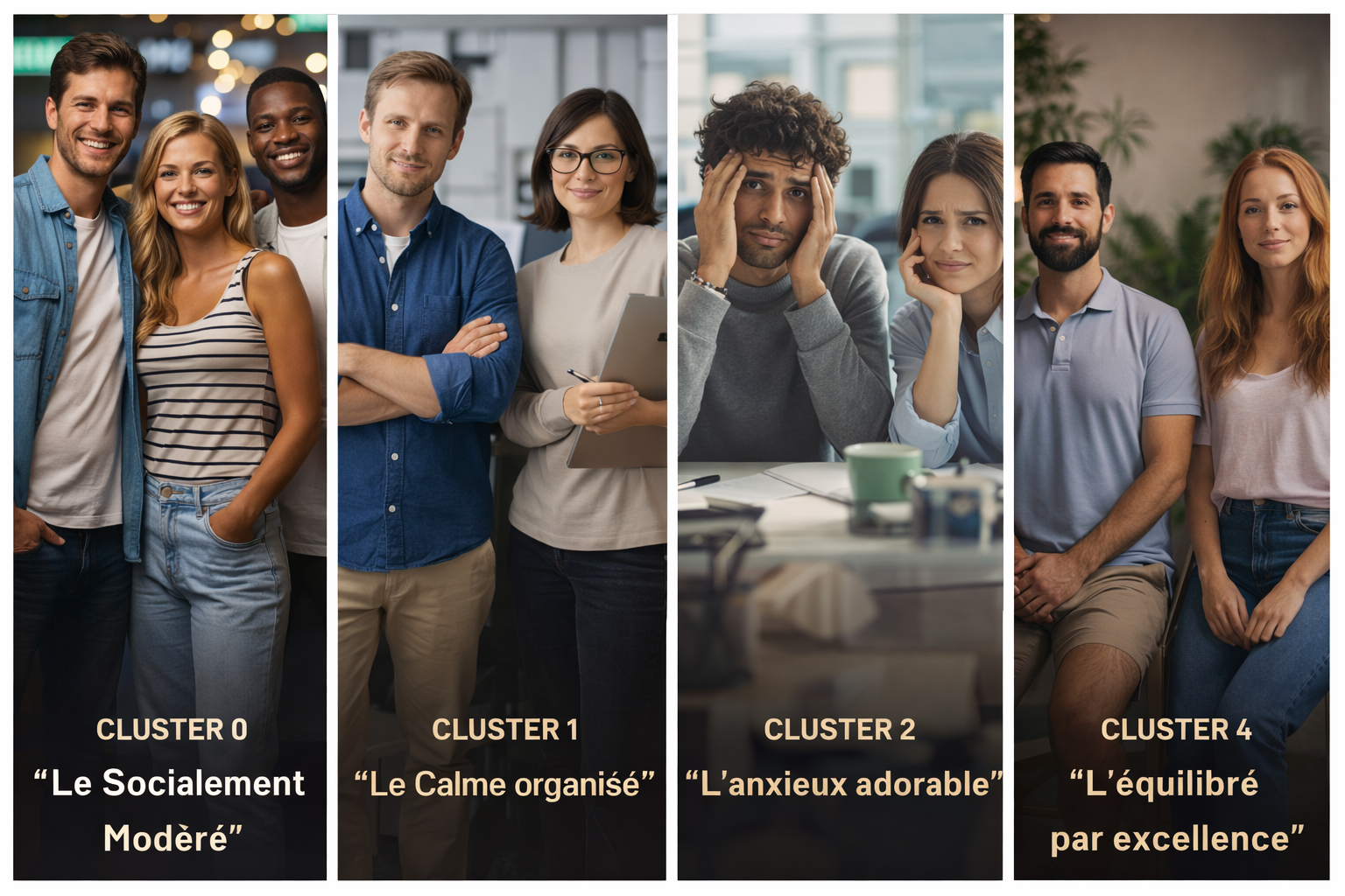 Avec Dataiku, il est très simple d’obtenir rapidement des résultats exploitables visuellement. Et avec l’aide d’un LLM, il devient même possible de construire un storytelling cohérent autour des schémas identifiés. De mon côté, j’ai obtenu une segmentation en quatre profils (cluster). J’ai ensuite appliqué le modèle sur de nouvelles données, récoltées auprès de mes collaborateurs BIIR, qui ont été classés dans ces différentes catégories.